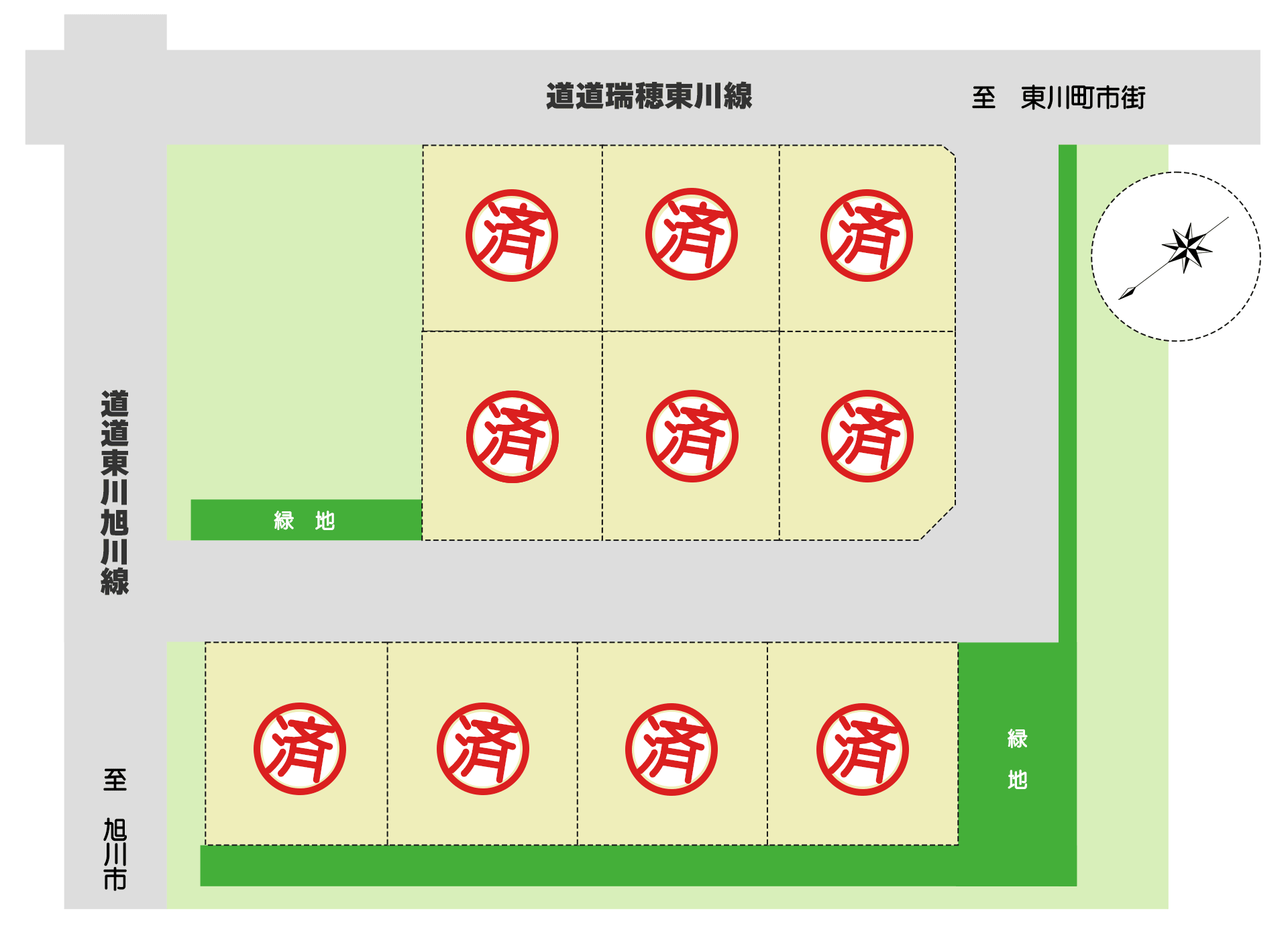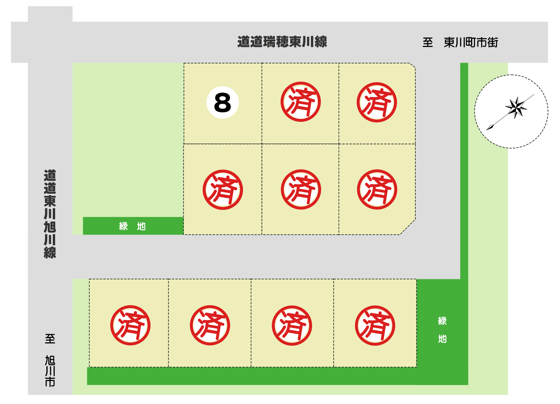 | 総区画数 | 一般住宅用3区画(区画8) (店舗併用可:基準あり)92.37坪~102.85坪 |